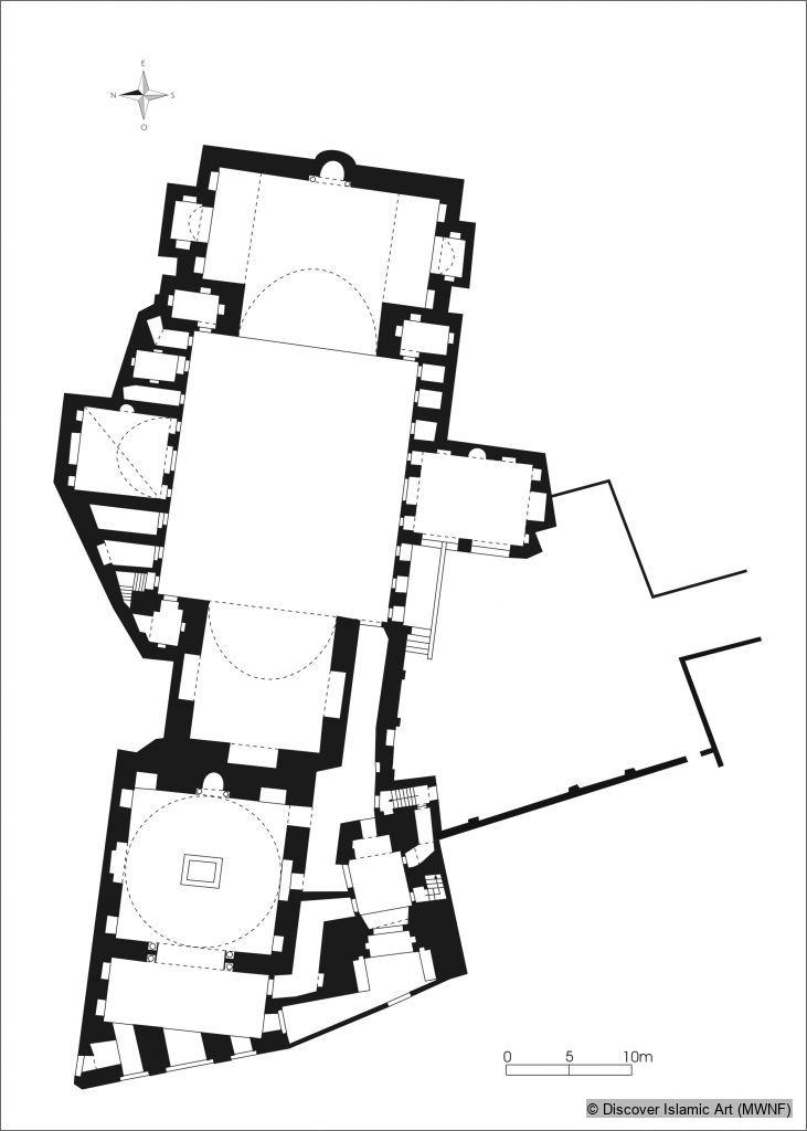 The khanqah consists of a rectangular, central open courtyard measuring 16.50 m x 20 m; there are two large iwans on its east and west sides, the bigger of which is the qibla iwan measuring 10 m x 12 m. In the middle of the qibla iwan there is a stone mihrab, which is simple and devoid of ornamentation. This might be due to the fact that the building was a sufi khanqah. At the north and south sides of the courtyard are the cells or the living quarters designated for the sufis. The waqf deed for the khanqah indicates that the building comprised three stories which included 100 sufi cells for permanent residence. Today only 11 of these cells are extant. The floor of the mausoleum is decorated with black and white marble and the walls are adorned with fine marble revetment to a height of 3.6 m. The mausoleum contains the grave of the builder and a lofty mihrab panelled with fine marble. Many of the building's annexes, such as the bakery and the kitchen areas, have been destroyed.