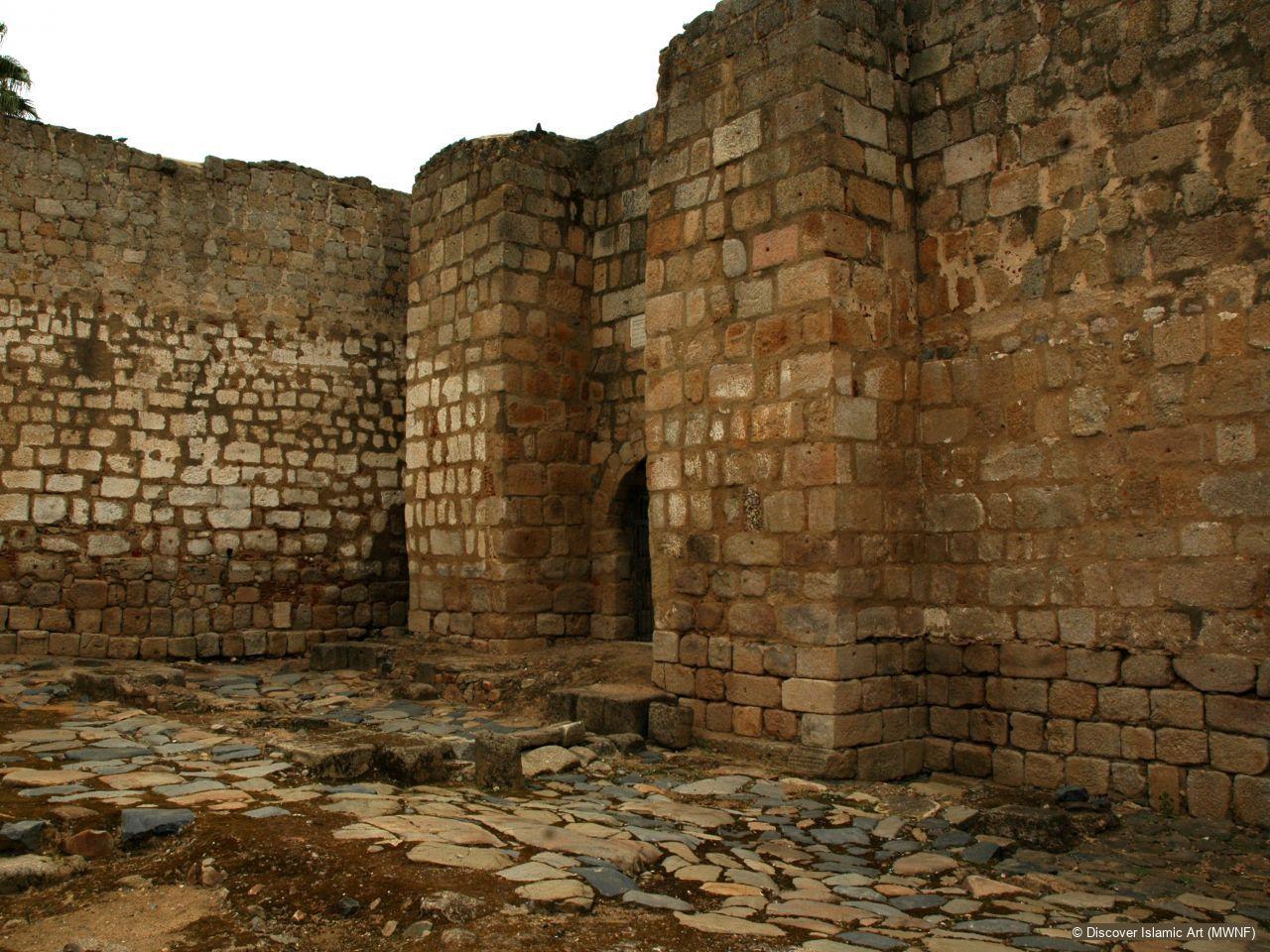 The citadel sits on the bank of the Guadiana River next to the bridge and its wall is built on a Roman containment-dyke. It is a square enclosure of some 130 m2 with a perimeter of 550 m. The walls, 2.70 m thick and 10 m tall, are built of granite ashlars taken from existing Roman and Visigothic buildings. The wall is strengthened by a series of large quadrangular towers that act as buttresses. The main entrance to the enclosure is a horseshoe arch situated on the north side and flanked by two towers. This entrance was protected by a rectangular courtyard with another two gateways (one to the bridge and one to the city) that acted as a barbican or initial defensive area.