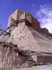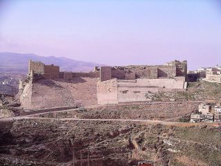 The Frankish castle of Karak was commissioned by Payen le Boutellier in AH 534 / AD 1139 and completed in 537 / 1142. It was built on an elevated escarpment following its contours. Protected by deep dry moats, a massive glacis (paved steep slope) secured the southeastern approach.. Two types of stone were employed in the construction: a hard blackish-red chert representing the Crusader stage, and a fine yellowish limestone belonging to the Ayyubid–Mamluk period. The castle was taken by the forces of Salah al-Din (Saladin) soon after 583 / 1187 and was refortified several times in the following centuries.