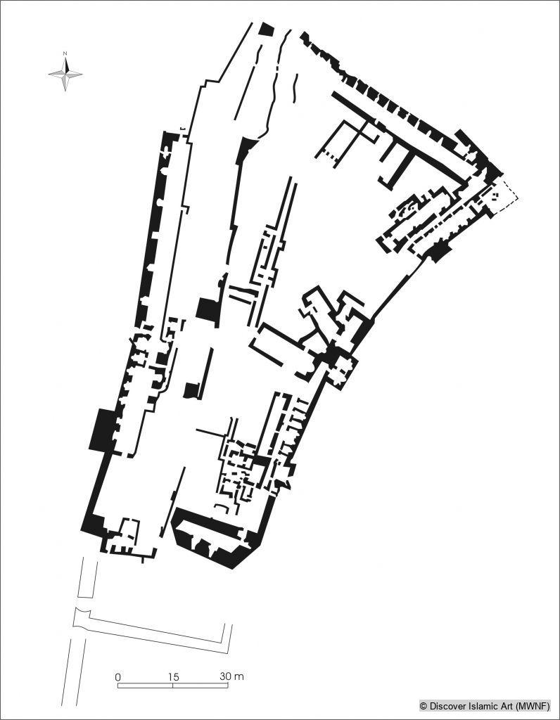 Karak lies east of the Dead Sea in the biblical land of Moab, some 120 km south of Amman. The Frankish Castle, perched on an elevated escarpment, was laid out on a roughly trapezoidal plan which followed the contours of the ridge on the western and eastern sides (240 m and 220 m respectively), while on the northern and southern fronts (130 m and 85 m respectively) the castle was protected by deep dry moats. Placed beneath the southeastern battlement, a massive glacis (paved steep slope) was placed to secure that direction. Originally access to the castle was via a bridge that crossed a dry moat. This led to an elbow-shaped entrance in the western flank of the eastern salient in the north wall.