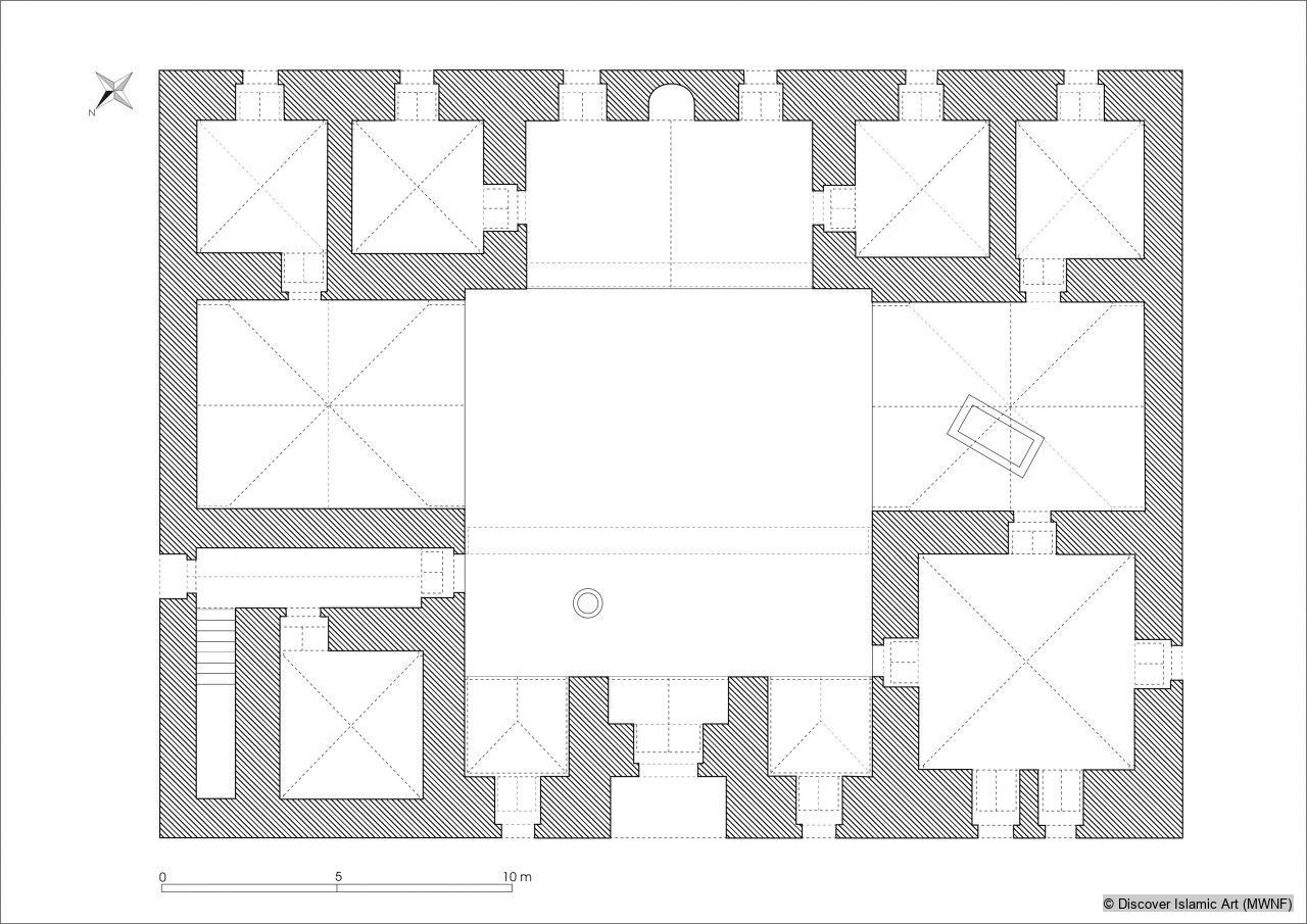 The interior is clearly an axial symmetric four-iwan plan, The courtyard's northern façade is a row of three arches of equal height. The southern, main, iwan has a central mihrab flanked by windows that originally overlooked the gardens of the Yazid, a tributary of the Barada River. Because the madrasa was built on a slope, the north and south iwans are not very spacious. The east and west iwans are roofed by double groin vaults. A founder's tomb lies diagonally and off-centre in the west iwan, assumed to be the burial site of the patron, Rabi'a Khatun. A pair of parallel open archestower higher than the madrasa's walls and offer an increased stature to the interior.