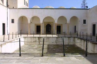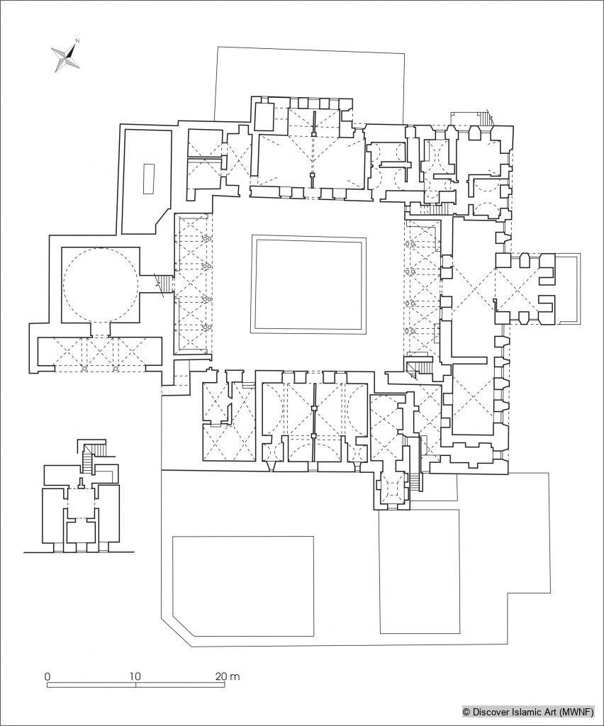 On the first floor, the actual living areas are arranged around a courtyard embellished in the centre by a rectangular water feature. The facades are twinned symmetrically, two under each portico. The entrance and one room each have an arched doorway, flanked by windows. Three large median-alcoved rooms look out towards both the courtyard and the outside. In the northeast corner, opposite the entrance, stands a square tower that appears to have come from an earlier Almohad building. The view from the top of this tower is astonishing. One looks over the terraces and over an amazing variety of domes covering halls and rooms; a succession of high-corner vaults, barrel-vaults intercut with groined vaults and hemispherical vaults.