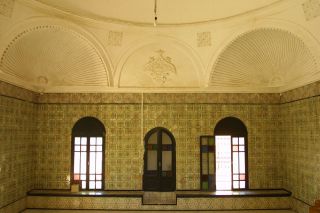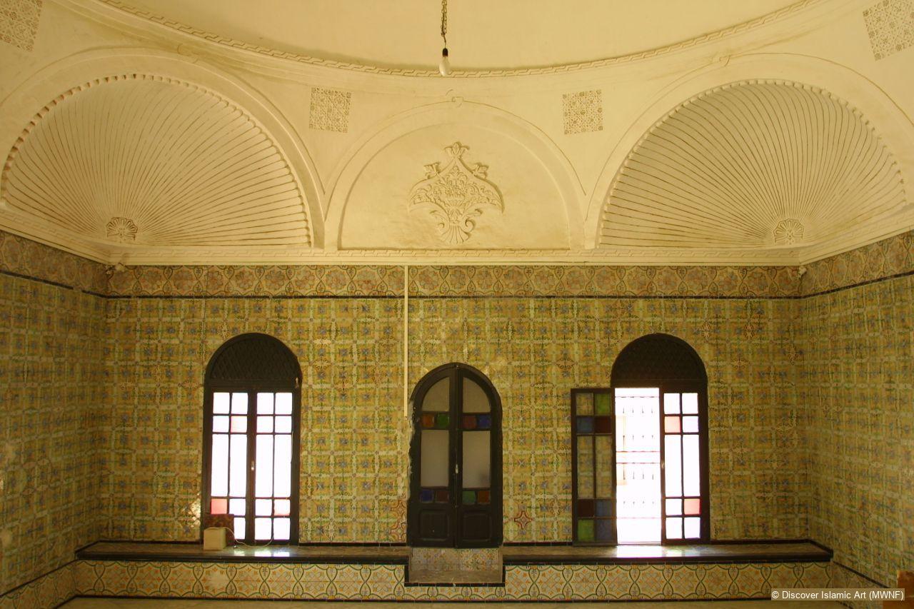 The Abdelliya was part of a group of three buildings erected in the central part of vast gardens reserved for the court as a holiday residences. The only surviving building is that known as the Grand Abdelliya. The main entrance is through a portico with three pointed arches resting on stone columns with Turkish capitals. The studded door beneath the pointed arch is framed in stone. The first hallway (driba) is square in plan. The presence of benches, and of a niche where the prince probably sat, indicates that the driba was used to receive audiences or for lawsuit hearings. It is roofed with a dome on scalloped squinches, decorated with Husaynid bouquets carved in plaster. The walls are covered with 19th-century Italian ceramics. A staircase leads to the courtyard and to the apartments.