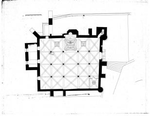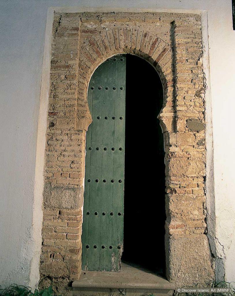 The structure of the mosque, built in the second half of AH 6th century / AD 12th century and consecrated for Christian worship after the Reconquista is still perfectly legible in this record. It shows a church with five aisles, each with its own pitched roof. Still remaining of this structure are the outside walls and four small doors (three opening onto the former courtyard and another to the outside) in which the slightly stilted horseshoe arch is framed by an alfiz (decorative rectangular surround).