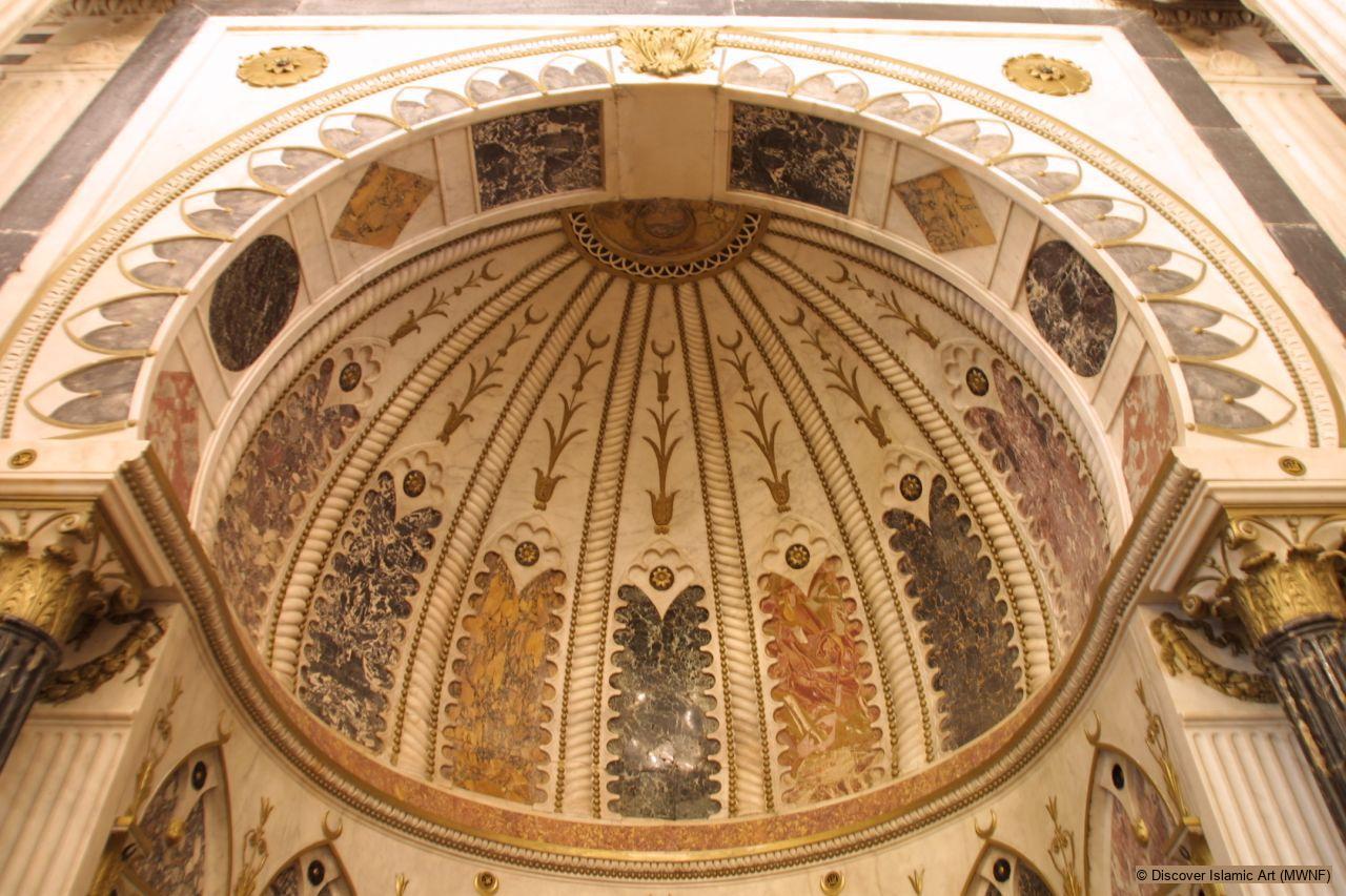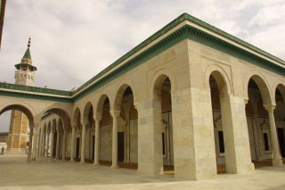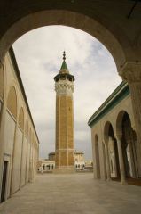 The Mosque of Yussef Sahib al-Taba‘a dominates the Halfawiyyne Square (alfa-grass sellers) and is built above shops and warehouses. It bears the name of its founder, Yussef Sahib al-Taba‘a, minister to the Husaynid bey, and adjoins two madrasas and the tomb of its founder. Its decoration reveals a western influence, with marble pieces, more abundant that in other places, imported from Italy. Its slender, fluted columns are crowned with composite capitals, while the polychrome marble decoration on the mihrab and the fixed minbar mixes pseudo-Gothic arcatures and floral decoration.