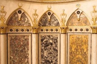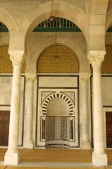 There is more western influence in the decoration of this mosque than in any other Tunisian oratory. The marble is more abundant than elsewhere and imported direct from Carrara (Italy). The long columns are fluted and have composite capitals; the consequence of an Italian interpretation of the Tunisian model in the Turkish period. The arches do not curve inwards enough at the base to be called horseshoe arches. The lintels are loaded with neo-Baroque bas-relief carvings. The marble panelling applied to most of the wall area leaves little space for ceramic tiles, which only figure in the upper parts, in the spandrels of the arches. The decoration of the mihrab and of the fixed minbar, in polychrome marble, mixes floral ornamentation (some gilded) with pseudo-Gothic arcatures.