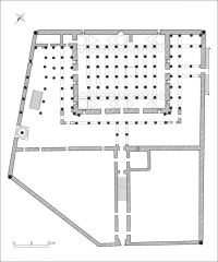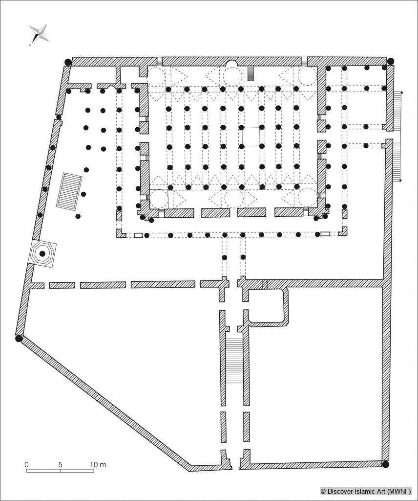 The Sahib al- Taba'a Mosque dominates the Halfawiyyne Square (alfa-grass sellers). It looms over the shops and warehouses. The prayer hall is framed by three galleries. From the square an elbow-shaped staircase leads to the east gallery which has a double colonnade and five arches opening onto the square. An octagonal minaret stands at the right-hand corner. It remained unfinished at the death of the founder of the building and did not get its lantern until the 1970s. This gallery has an outside mihrab for fine-weather devotions.