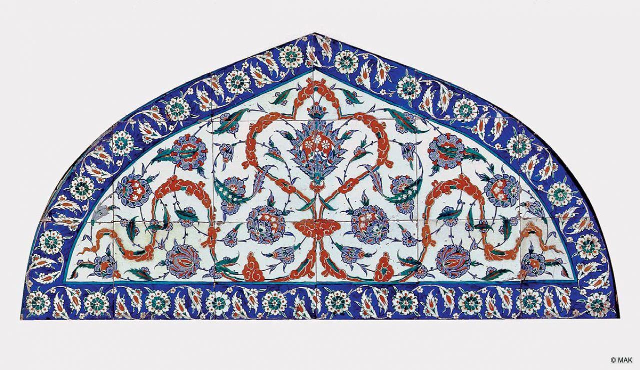 The tympanum consists of 16 assembled tiles and comes from the palace of the grand vizier Piale Pasha (c.1515– 1578) or the mosque he founded. Both were finished in 1573 and were decorated lavishly with tile fields. A lucky knot motif of cloud bands in so-called “tomato red” dominates in front of spirals. Palace and mosque were “renovated” after the earthquake of 1890, and tile tympana sold world-wide through dealers. At least nine identical tympana are now kept in European and American museums.
