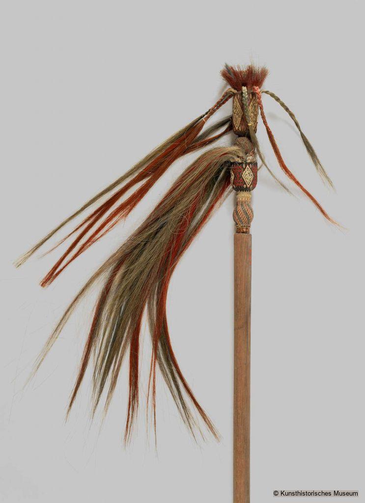 Tulgars with horse tails were ancient Ottoman symbols denoting social rank; the Turks had brought them with them when they emigrated from their Central-Asian homeland. Part of Archduke Ferdinand’s Turkish booty, this one may have been used during his “Hussars’ tournaments”. The shape and number of horse tails denoted the rank of an Ottoman dignitary. They were placed in front of his tent and accompanied him when the army was on the march. The Sultan was accorded seven or even nine horse tails as a symbol of his authority.