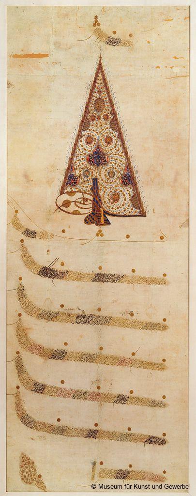 The Ottoman Sultan's certificate presents an expressive, secular form of calligraphy. It is crowned by the ornate, triangular seal of the Sultan, the tughra. Here, it is the tughra of Sultan Mahmud I (1730-1754). The lines are written narrowly in gold, black and, red ink and each one is written in an upward curve to prevent the possibility of forgery. Official, ornamentally decorated documents, such as this one, would hang in offices or private houses and served as status symbols.