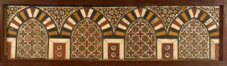 A marble panel composed of four, pointed blind arches formed from white, black, red and yellow marble pieces. The arches are borne by three square piers in the middle and two rectangular piers at either side. Broad white bands frame the three middle piers along the top and sides, while the two side piers are framed in white only along the top and on the underside. The white borders of these piers enclose red areas. The three middle piers enclose areas that are embellished in the centre with two roundels ornamented in white and red. The zones within the arches are filled with geometric decoration consisting of crosses and eight-pointed stars in multicoloured marble and framed in mother-of-pearl. The triangular spaces in between the outer curvature of the arches are filled with polygonal shapes and six-pointed stars which in their turn are divided into small triangular and star-shaped units. Mother-of-pearl is used to decorate the borders of these surfaces and the small triangular units.