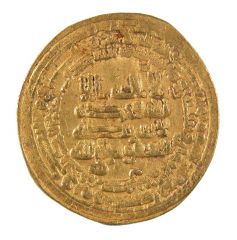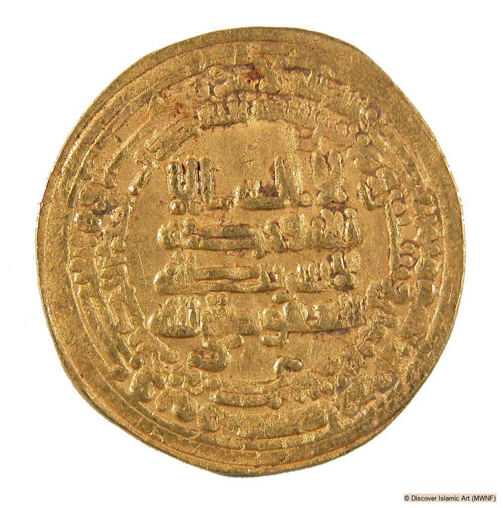 A gold coin worth a dinar. Inscriptions in kufic script appear on the obverse and on the reverse. The centre, obverse, holds a five-line inscription that reads: 'To God / Muhammad / Prophet / of God / Sanctioned by God'. The margin, obverse, bears a circular inscription that reads: 'Muhammad, the Prophet of God. It is he who has sent his messenger with guidance and the religion of truth to prevail it over all religion even though it is hated by the pagans'. On the reverse, the coin bears at its centre four lines of inscription that reads: 'There is no God except / the One God / Who has no Partners / Authorised by God'. On the outer margin, reverse, there is a circular Qur'anic inscription (Chapter 30, 'Romans', verses 4 and 5): 'With Allah is the Decision in the Past and in the Future. On that day will the Believers rejoice with the help of God'. Along the interior margin, reverse, a circular inscription states: 'In the name of God this coin was struck in Egypt the year 268 AH' (AD 881).