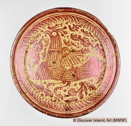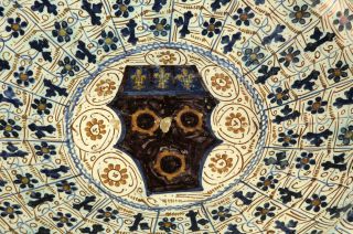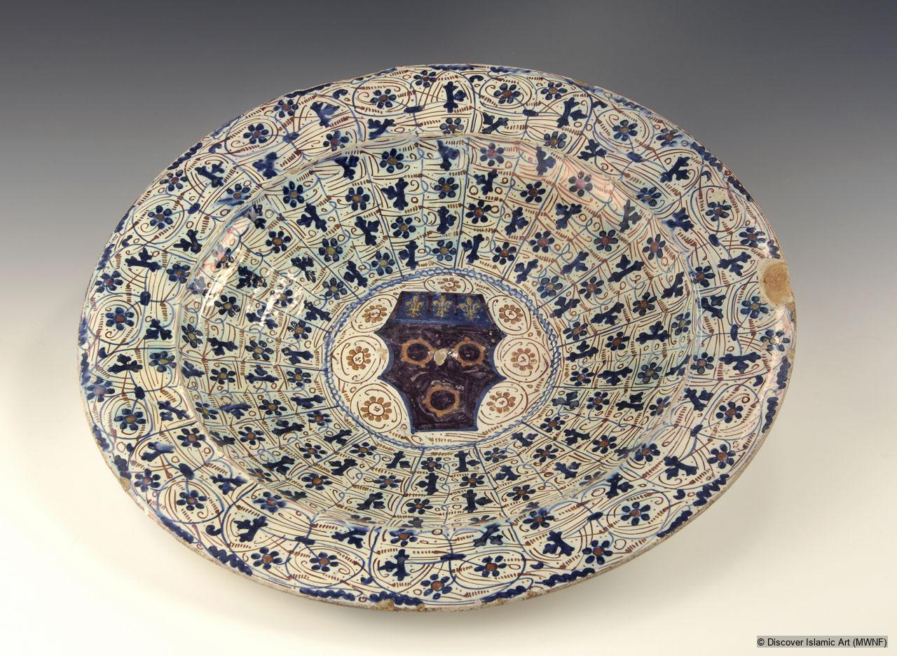 A dish with the shield belonging to the Tondi family of Siena, Italy, in the centre surrounded by radiating chains of 'bryony' flowers (those with blue petals and lustre-painted centres) alternating with chains of blue 'parsley'-shaped leafs (those that are made up of ragged trefoil shapes), and both interwoven with lustre-coloured spindly 'fern' leaves. This style of dish belongs to a distinctive range that was much sought after in Spain and in other parts of Europe where it was exported in large quantities. This explains the presence of the Italian family's shield, for this type of lustre-ware was extremely popular in Italy.