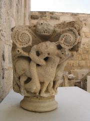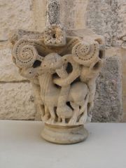 This column capital is a good example of the process of the effacement of Christian representational iconography. Despite the preservation of most of the constituents of the capital, which clearly manifest its origins and epoch, the animated features on it have largely been obliterated. The process of effacement may have taken place hurriedly, or it may have been a symbolic act, since clear traces of the birds' features remain in addition to vegetal decoration.