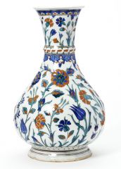 A vase with a wide neck, bulbous body, and low flaring foot. A narrow collar around the neck, decorated with a braided rope design, divides the vase into two areas of decoration. Both are filled with floral motifs in red, green, and blue. These include carnations, tulips, and hyacinths, all of which are shown blossoming at the ends of gently undulating green stems. The use of a brilliant emerald green is characteristic of Iznik ceramics at their peak of quality, in the 1570s. Shortly thereafter, slackening patronage and other factors led the Ottoman ceramic industry to economic and aesthetic decline. This vase, then, is a splendid token of the high point of 16th-century Ottoman ceramics.